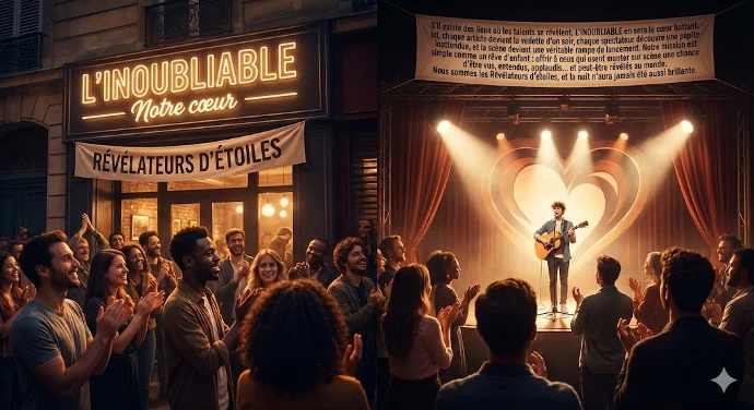 S’il existe des lieux où les talents se révèlent, L’INOUBLIABLE en sera le cœur battant. Ici, chaque artiste devient la vedette d’un soir, chaque spectateur découvre une pépite inattendue, et la scène devient une véritable rampe de lancement. Notre mission est simple comme un rêve d’enfant : offrir à ceux qui osent monter sur scène une chance d’être vus, entendus, applaudis… et peut-être révélés au monde. Nous sommes les Révélateurs d’étoiles, et la nuit n’aura jamais été aussi brillante.